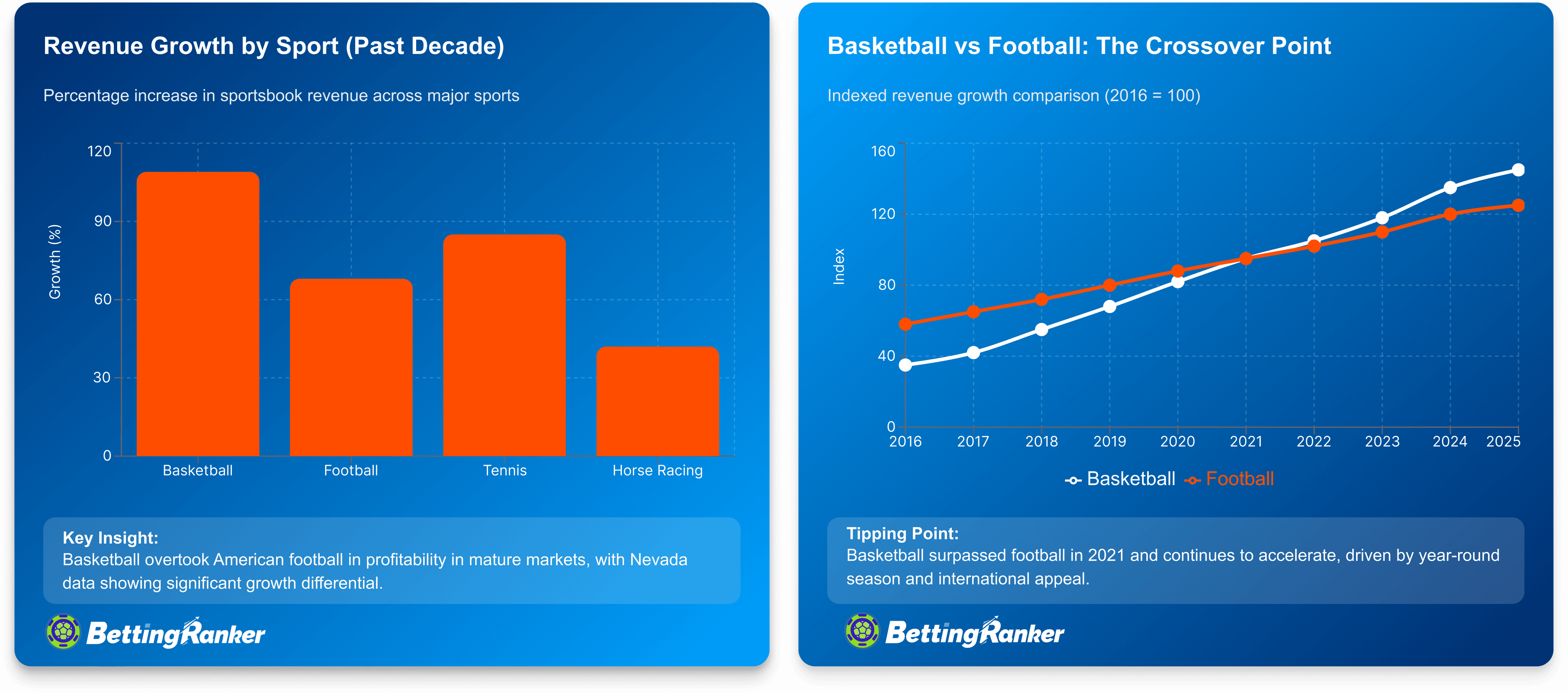 The decade from 2016 to 2026 witnessed dramatic shifts in betting patterns. Basketball experienced explosive growth, with Nevada sportsbook win data showing an increase from $72.9 million (2015) to $152.5 million (2024)—a 109% surge. Meanwhile, soccer maintained its global #1 position through sheer international reach and 365-day availability. Tennis grew substantially through live-betting efficiency, with point-by-point wagering creating multiple betting opportunities within single matches. Horse racing stabilized but faces demographic challenges as its core audience ages. Most surprisingly, American football's market share declined from 35.61% to 28.78% in Nevada despite absolute revenue growth, as daily sports captured increasing wallet share from seasonal leagues.